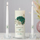 Beautiful romantic wedding unity candle set featuring emerald green and beige flowers and some leaves .