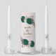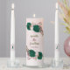 Beautiful romantic wedding unity candle set featuring emerald green and pink flowers and some leaves .