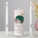Beautiful romantic wedding unity candle set featuring emerald green and pink flowers and some leaves .