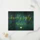 An emerald green rustic barn wood boho RSVP card with chic gold typography. The reverse features your details and a fun guest song request. Designed by Thisisnotme©