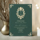 Luxurious 5x7 wedding invitation in elegant emerald green with ornate baroque gold flourishes. The vintage Victorian frame highlights a monogram at the top, giving this card a sophisticated and timeless style. Perfect for formal weddings, this emerald green design adds a touch of royal charm and luxury. Matching wedding stationery available to complete the suite.