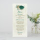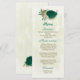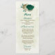 Beautiful romantic wedding menu card featuring emerald green and beige flowers and some leaves .