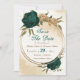 Beautiful wedding save the date card featuring emerald green and beige gold flowers with green leaves .