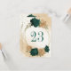 Beautiful fall wedding table number card featuring emerald green and beige gold flowers with green leaves .