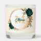 Beautiful wedding scented candle featuring emerald green and beige gold flowers with green leaves .