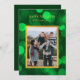 This photo holiday card features your photo and the words "Happy New Year" in faux gold foil against an emerald green bokeh lights pattern background. Card has a dark green background back side.