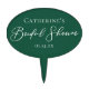 An elegant emerald green bridal shower cake topper for an outdoor forest party. Personalize this pretty decor with the bride's name in chic white minimalist typography.