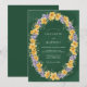 A deep emerald green backdrop sets a sophisticated stage for vibrant yellow primroses and delicate lavender blossoms. The design showcases a lush border of botanical elements, including verdant leaves and tiny purple petals. This organic color palette of forest green, gold, and violet creates a fresh and elegant atmosphere for a seasonal nature-themed event.