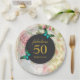 A birthday paper plate - fabulous 50 with a personalized name. Designed with elegant green butterflies. A black circular frame in the center layered over top a vintage collage pattern with dainty pink roses and green gold leaves with a shabby old fashioned look.