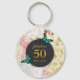 A birthday keychain - fabulous 50 + a name. Designed with an elegant green butterfly. A black circular frame in the center layered over top a vintage collage pattern with dainty pink roses and green gold leaves with a shabby old fashioned look.