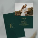 Announce your special day in style with our Emerald Green Custom Photo Save the Date Card. The top half features a photo, complemented by gold text against an emerald green background below. The back displays elegant gold monograms on an emerald green backdrop. A chic and personalized way to mark your wedding date.