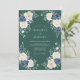 This design features a rich forest green backdrop that sets a moody and formal tone. Creamy ivory roses and deep navy blue blossoms create a striking contrast in the corners of the composition. Delicate green foliage and leafy sprigs add a natural, botanical touch to the wintertime aesthetic. The palette of emerald, navy, and white evokes a sense of timeless elegance.