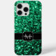 Emerald Green faux glitter sparkles Monogram iPhone 15 Case. Personalize Sparkly iPhone case with your initial and name. Beautiful girly glamorous shiny glitters sparkles. Photo of sparkles not actual glitter!