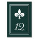 Elegant and simple Wedding Table Card featuring a fleur de lis against an emerald green background. This design is a unique choice for a modern wedding. Easy to customize with the appropriate table number(s). Click "Customize It" to find more personalization options.