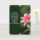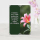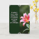 The front design shows a split layout framed by a white border with small curled decorations in the corners. On the left, a deep emerald-green panel sets a calm mood, like a quiet room where kind words are shared ❤️. A white flowing inscription sits centered on that green space, with lines stacked neatly from top to bottom, describing a mother’s love as gentle and strong, giving and demanding in the same breath. On the right, an open flower fills most of the space, its petals ranging from rich cerise to soft blush pink, as if leaning in close like an affectionate friend 🌼. Fine veins run through each petal, adding texture that feels intimate, like details you notice when you’re paying attention. Near the center, golden anthers dusted with pollen rise from a creamy core, drawing your eye the way a tender glance does. Behind the bloom, the greenery fades into a soft blur while the flower stays sharply detailed against the pale white frame.