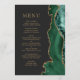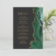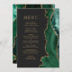 The right-hand edge of this elegant modern wedding menu features an emerald green watercolor agate border trimmed with faux gold glitter. The customizable text combines gold-colored serif and copperplate fonts on an off-black background. The reverse side features a matching green and gold agate design.