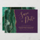 This elegant modern save the date card features an emerald green watercolor agate border trimmed with faux gold glitter. The customizable text combines gold colored handwriting script, copperplate and italic fonts on a purple background. The reverse side features a matching emerald green and gold agate design.