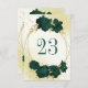 Beautiful fall wedding table number card featuring emerald green and beige gold flowers with green leaves .