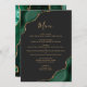 This elegant modern wedding menu features emerald green watercolor agate corners trimmed with faux gold glitter. The customizable text combines gold-colored whimsical handwriting script and copperplate fonts on a slate black background. The reverse side features a matching emerald green and gold agate design.