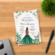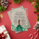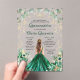 The invitation features an elegant, nature-inspired design with a watercolor frame of greenery and floral accents in green and gold. At its center is an illustration of a young woman in an emerald-green gown with flowing hair adorned by a golden crown. The text is styled in a mix of cursive and serif fonts, with gold embellishments like a crown adding a regal touch. The layout is balanced, combining sophistication with a graceful, formal aesthetic.