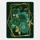 Design features a printed colored floral element in shades of emerald green and gold. Green canvas textures with faux gold geometric frame and peony blooms with gold calligraphy script or type writing. Great for your wedding celebrations!