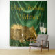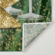 Womans emerald green and gold birthday party banner backdrop with beautiful gold high heel shoes, gift box, perfume and champagne glasses on a beautiful emerald green satin background. This beautiful emerald green and gold high heel shoe backdrop banner is easily customized with the text of your choice in the font style and font color of your choice.