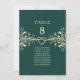 Elegant emerald green and gold seating chart card with floral accents and a romantic rope heart design. This double-sided table card helps guests easily find their seats at your reception. Perfect for formal, classic, or modern weddings in any season, especially fall and winter. Personalize with table numbers and guest names to match your wedding theme. Coordinates beautifully with matching invitations, menus, programs, and stationery from the emerald and gold wedding collection.