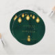 This round wedding menu card is like a little piece of magic! The front has a beautiful emerald green background with sparkling golden lights twinkling above, giving it a magical feel. You'll find the couple's names elegantly written, along with the wedding date and the venue. The back is also emerald green, with the same enchanting golden lights. At the top, it says 'The Menu' in a beautiful font. Below, you'll find a list of all the delicious dishes, from starters to desserts, all written in elegant gold. It's a truly special touch for your wedding celebration.