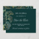 A modern and elegant Save the Date for a wedding. Emerald green background decorated with ginkgo leaves. Personalize and add a date and names. The text: Save the Date is written with a large trendy hand lettered style script.