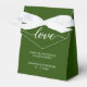 The emerald green color of the favor boxes creates a captivating visual impact, symbolizing growth, harmony, and prosperity. The black text beautifully contrasts with the vibrant green, ensuring clear and legible personalization. Complete the look with a white bow, or explore other bow color options to match your wedding theme perfectly.
