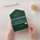 Elegant seal and send, minimalist, modern, gold and emerald green all-in-one wedding invitation with QR code, unique monogram with hand drawn love couple birds, trendy handwritten script and custom picture of the at the back.