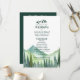 The deep forest green and emerald green colors used in the design give it a natural, rustic feel, perfect for a backwoods country wedding or a nature camping adventure. With towering mountain pine trees in the background, this design is sure to transport you and your guests to a serene forest setting.