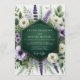 This design features a lush display of white roses, purple lavender, and violet anemones set against vibrant emerald green foliage. The organic arrangement creates a serene and elegant atmosphere, perfect for a nature-inspired spring nuptial. A deep forest green backdrop provides a sophisticated contrast to the delicate watercolor floral elements.