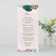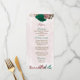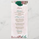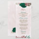 Beautiful romantic wedding menu card featuring emerald green and pink flowers and some leaves .