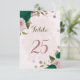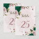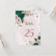 Beautiful romantic table number card featuring emerald green and pink flowers and some leaves .