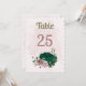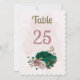 Beautiful romantic table number card featuring emerald green and pink flowers and some leaves .