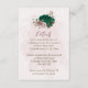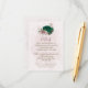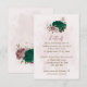 Beautiful romantic wedding reception details enclosure card featuring emerald green and pink flowers and some leaves .