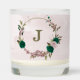 Beautiful romantic wedding scented candle featuring emerald green and pink flowers and some leaves .