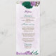 Beautiful romantic wedding menu card featuring emerald green and purple flowers and some leaves .