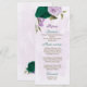 Beautiful romantic wedding menu card featuring emerald green and purple flowers and some leaves .