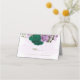 Beautiful romantic wedding place card featuring emerald green and purple flowers and some leaves .