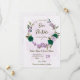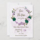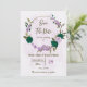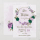 Beautiful romantic wedding save the date invitation featuring emerald green and purple flowers and some leaves .