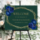 This elegant wedding welcome sign features a gold geometric frame decorated with royal blue flowers. Add the couple's names and wedding date in gold-colored text on an emerald green background.