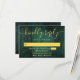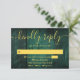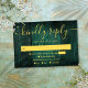 An emerald green rustic wood boho barn RSVP card with your details set in modern gold typography. Designed by Thisisnotme©
