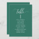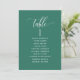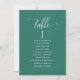 Help your guests find their table with this elegant modern seating plan cards with guests names. Double sided cards so guests can look from both, front or back for their names. Clear space all around giving you the liberty to use clips or punch hole for hanging displays, or use table holder/frame. Emerald green background and white text. Modern hand written calligraphy details. Several color options. Have all table numbers in same color or mix colors according to your event's color theme.