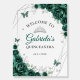 Emerald green silver and white Quinceanera welcome sign foam board sign. Features, script font, silver butterflies, watercolor roses and tiara. Perfect for an elegant princess style glam celebration. Personalize with your own details.