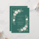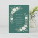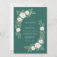 This design features a deep emerald green backdrop that highlights lush cream roses and soft eucalyptus greenery. The botanical arrangement creates a moody yet elegant aesthetic perfect for a nature-inspired winter or woodland event. Delicate white petals and verdant leaves provide a sophisticated contrast against the rich dark background.