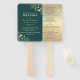 Elegant, luxury, vintage, emerald green wedding program hand fans with gold gilded floral lace and simple calligraphy script.