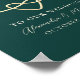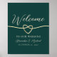 Elegant, modern, minimalist emerald green wedding welcome poster with faux gold rope heart and simple handwritten calligraphy script.