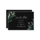 This emerald greenery black horizontal save the date card is perfect for a boho wedding. The elegant yet rustic design features moody dark green watercolor leaves and eucalyptus with a modern bohemian woodland feel.
